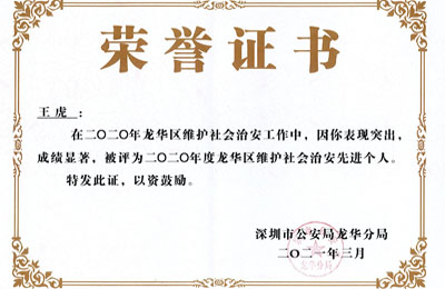 熱烈祝賀我司鐵保宏泰深圳保安公司總經理王虎先生,在2020年龍華區維護社會治安工作,因表現突出,成績顯著,被深圳市公安局龍華分局評為2020年度龍華維護社會治安先進個人。