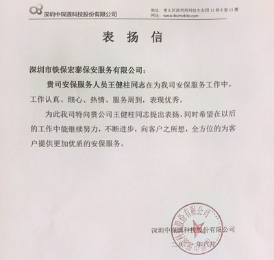 深圳中琛源科技股份有限公司致信表揚我司鐵保宏泰保安公司王健柱同志在安保服務工作中工作認證、細心、熱情、服務周到,表現優秀。
