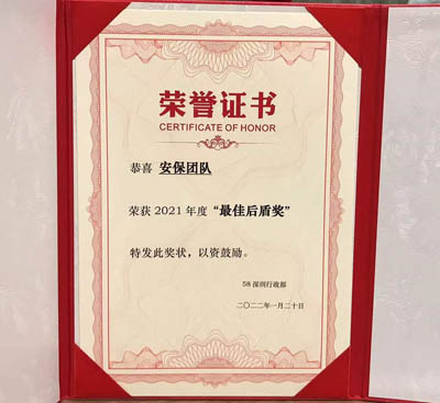 熱烈祝賀我司鐵保宏泰深圳保安服務(wù)公司安保團(tuán)隊(duì)榮獲58同城頒發(fā)2021年度最佳后盾獎(jiǎng)。