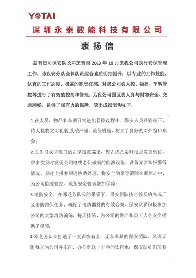 深圳永泰數能科技有限公司致信表揚我司鐵保宏泰深圳保安公司保安隊長鄧芝芳同志工作認真負責,有極高的責任感。特致信提出表揚及辦法優秀團隊獎榮譽證書。