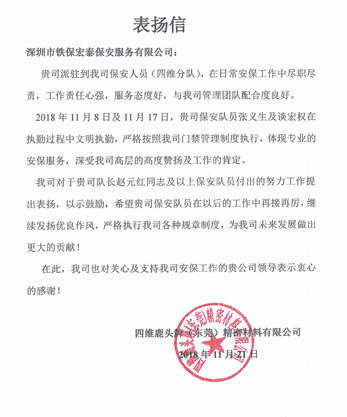 2018年11月8日及11月17日,貴司保安隊(duì)員張義生及談宏權(quán)在執(zhí)勤過程中文明執(zhí)勤,嚴(yán)格按照我司門禁管理制度執(zhí)行,體現(xiàn)專業(yè)的安保服務(wù),深受我司高層的高度贊揚(yáng)及工作的肯定。