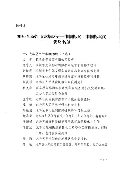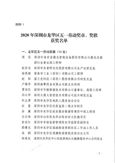 1. 2020年深圳市龍華區五一勞動獎章、獎狀獲獎名單。